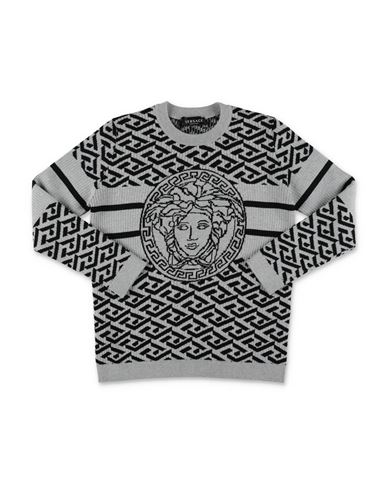 Stay on trend this Spring/Summer with the Men of Style Sweater from VERSACE. This sleek grey sweater is perfect for layering on those cooler days or wearing on its own when the sun is shining. Made from high quality materials, this sweater combines comfort and style effortlessly. Elevate your wardrobe with this versatile piece that can be dressed up or down for any occasion.