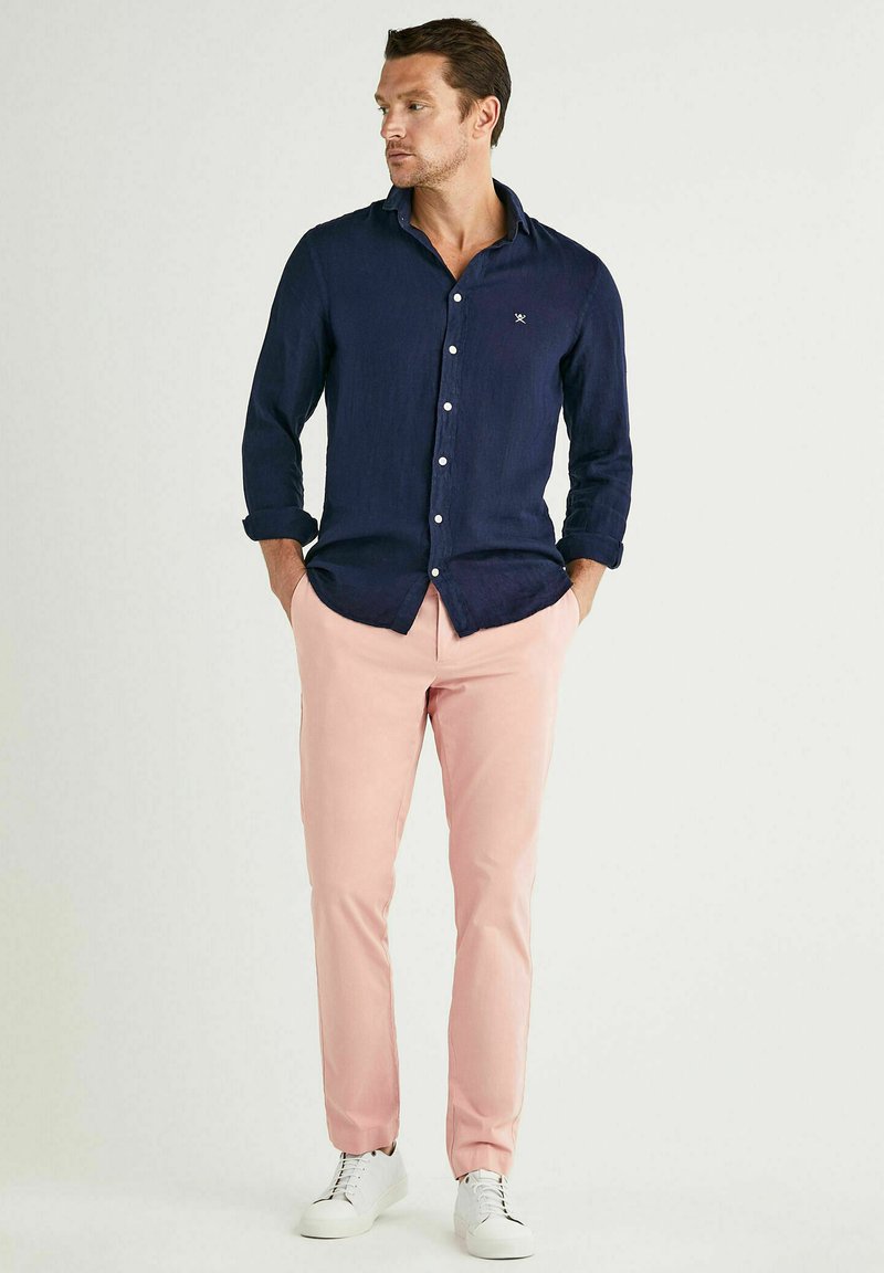 Introducing the Hackett London Casual/Elegant Chino for men, perfect for the Spring/Summer season. Crafted in a stylish brown color, this versatile piece effortlessly combines sophistication with laid-back style. Whether dressed up with a crisp shirt or down with a t-shirt, these chinos are a must-have for any man of style. Upgrade your wardrobe with this timeless piece from Hackett London.