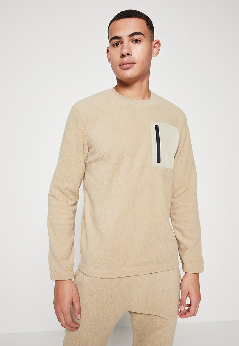Stay cozy and stylish in the Only & Sons Casual Men's Beige Hoodie. This soft and warm fleece hoodie is perfect for the Autumn/Winter season. With its neutral beige color, it's easy to layer with any outfit for a laid-back yet trendy look. Add the "felpa in pile" to your wardrobe for ultimate comfort and style.
