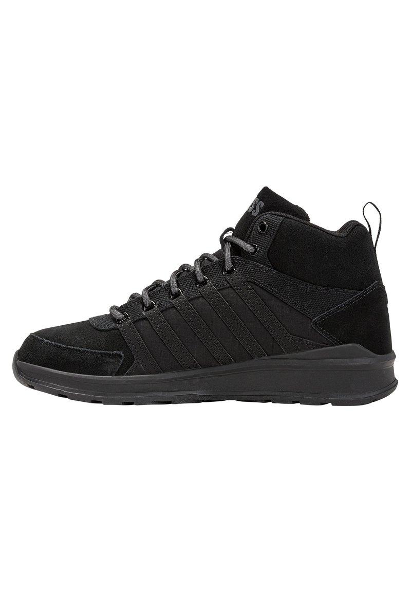 Stay stylish and comfortable this Autumn/Winter season with the K-SWISS Sportive/Casual sneakers for men. These black high-top sneakers are perfect for everyday wear, whether you're hitting the gym or running errands around town. Step up your shoe game with this versatile and trendy footwear option from K-SWISS.
