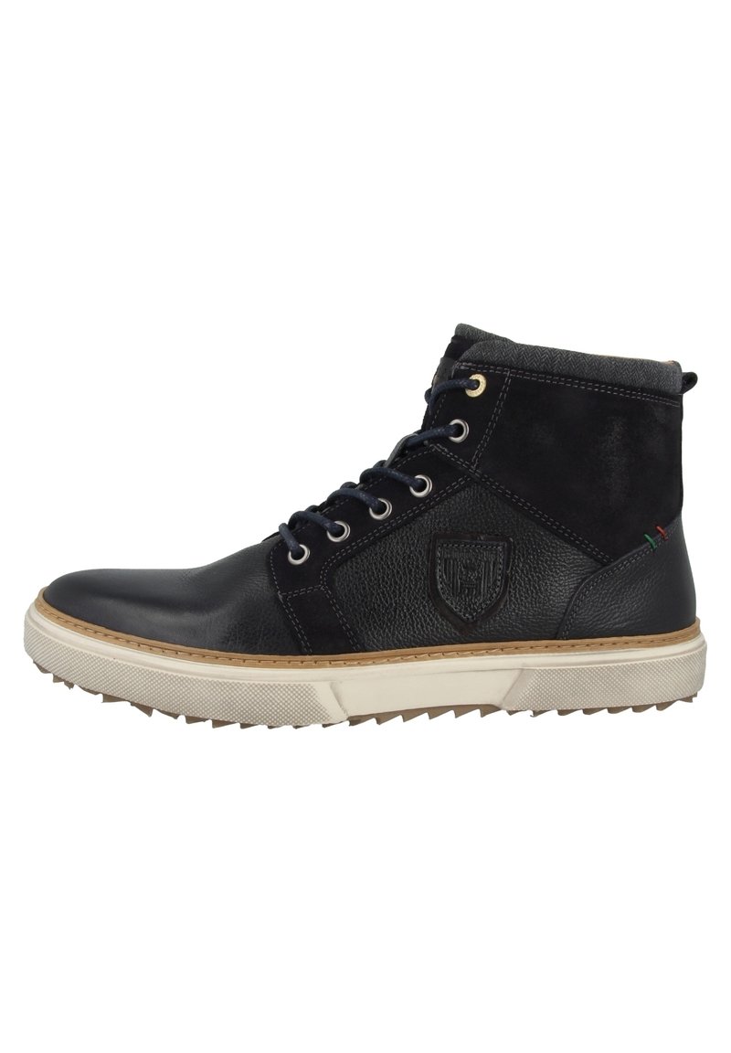 Elevate your casual style with these Pantofola D'Oro blue sneakers for men. Perfect for the Autumn/Winter season, these sportive shoes combine comfort and fashion effortlessly. The high-top design adds a touch of urban edge to your outfit, while the blue color complements any wardrobe. Step out in style and stay on-trend with these versatile shoes.