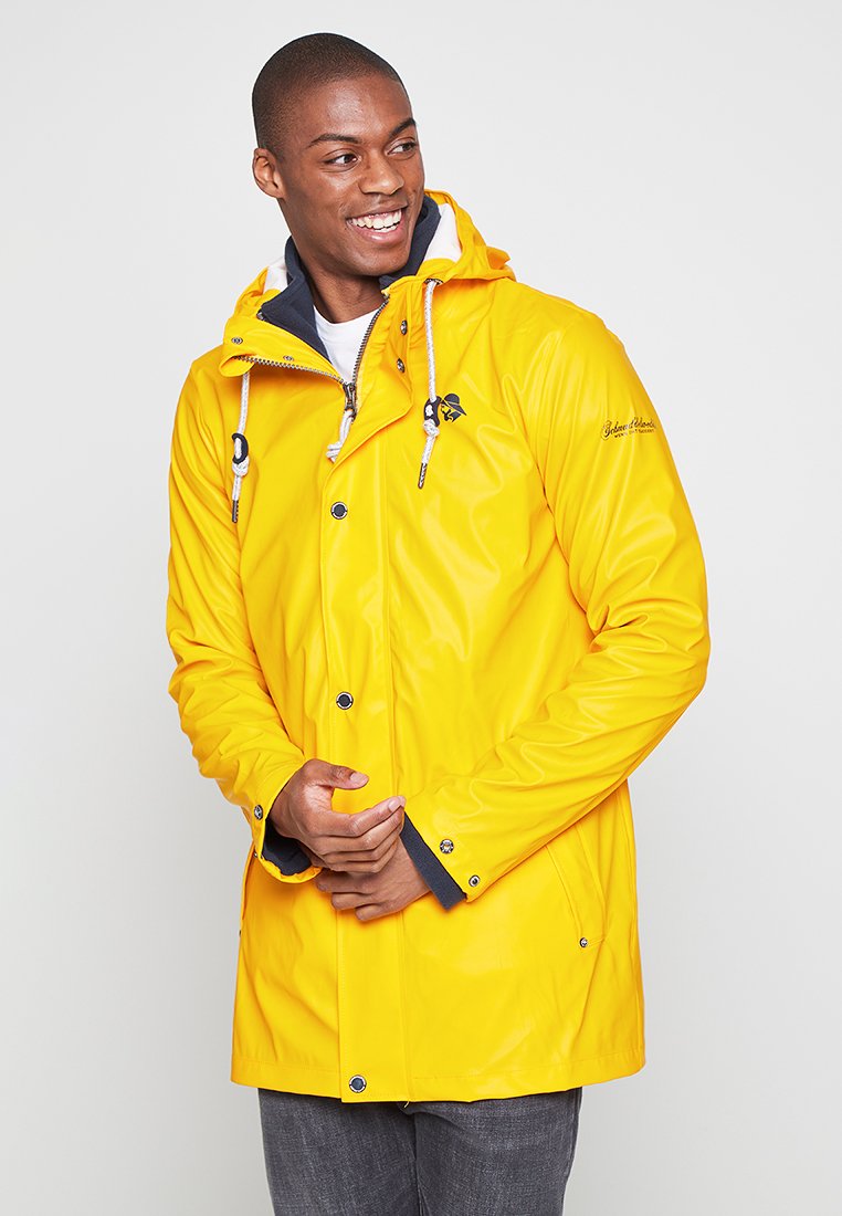 Stay stylish yet casual with this yellow waterproof jacket from Schmuddelwedda. Perfect for Spring/Summer, this jacket combines elegance with a laid-back vibe. Ideal for any man looking to add a pop of color to their wardrobe, while staying dry and fashionable.Upgrade your rainy day style with the Schmuddelwedda waterproof jacket in summery yellow.