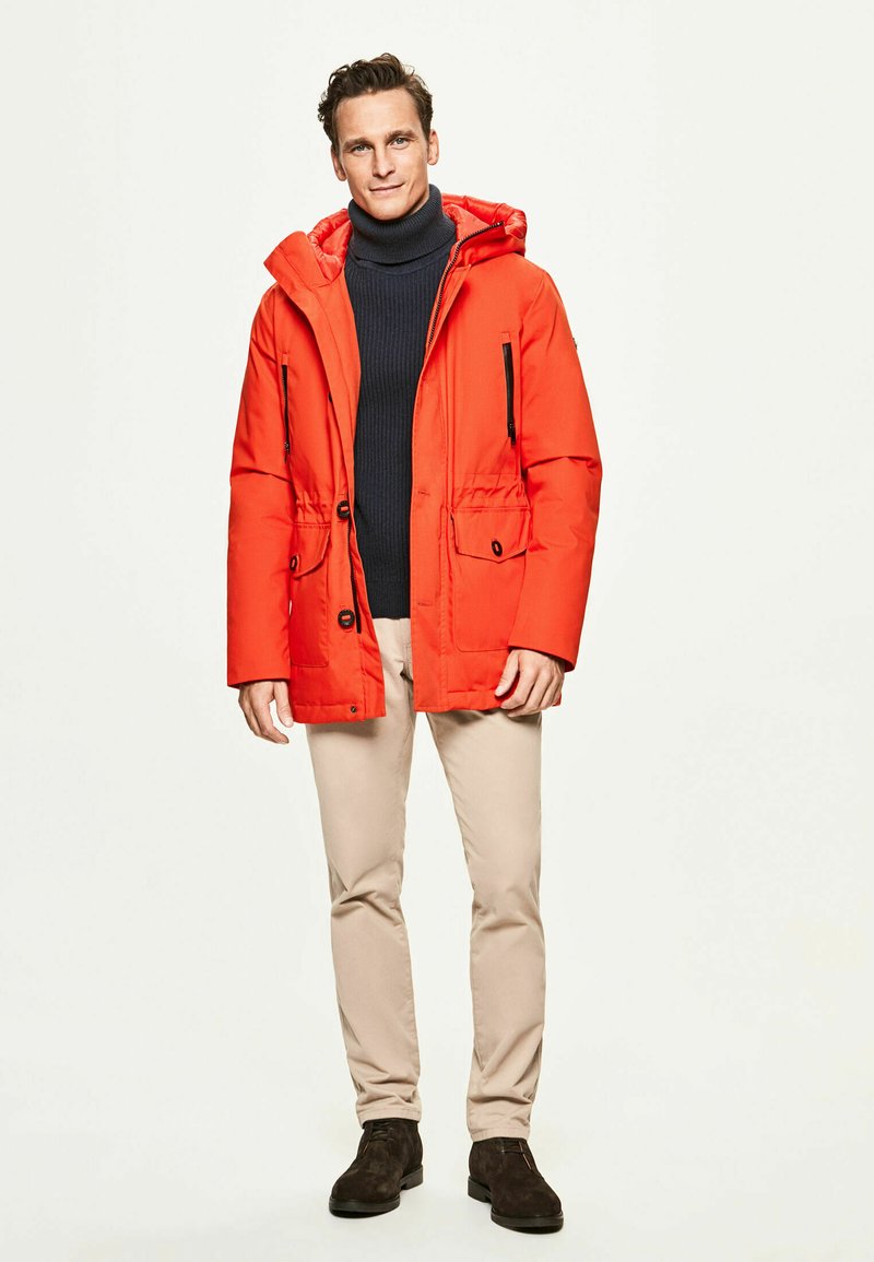 Stay stylish and comfortable this Spring/Summer with the Hackett London Casual/Elegant Man's Parka in vibrant Orange. This versatile piece is perfect for adding a pop of color to your wardrobe, whether you're running errands or heading out for a weekend brunch. With its relaxed fit and high-quality construction, this parka is a must-have for the modern man on the go. Elevate your casual look with this effortlessly chic outerwear piece.