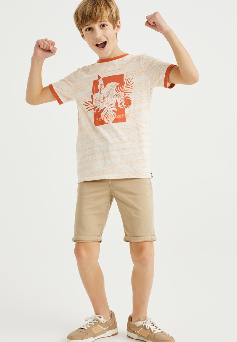 Elevate your spring/summer wardrobe with this stylish orange T-shirt from WE Fashion. The perfect choice for the man of style Casual, this tee features a trendy print and a comfortable fit. Pair it with your favorite jeans or shorts for a cool and casual look. Upgrade your casual wardrobe with this must-have T-shirt.