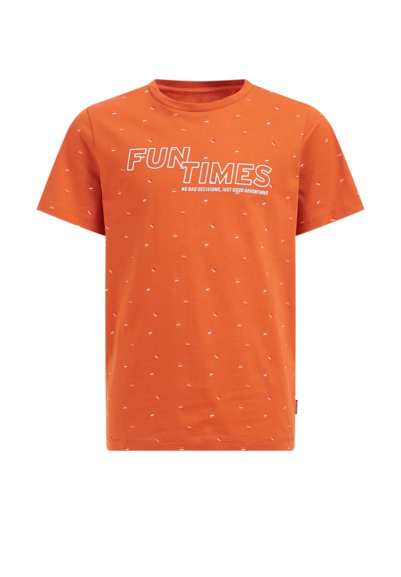 Elevate your spring/summer wardrobe with this stylish orange T-shirt from WE Fashion. The perfect choice for the man of style Casual, this tee features a trendy print and a comfortable fit. Pair it with your favorite jeans or shorts for a cool and casual look. Upgrade your casual wardrobe with this must-have T-shirt.