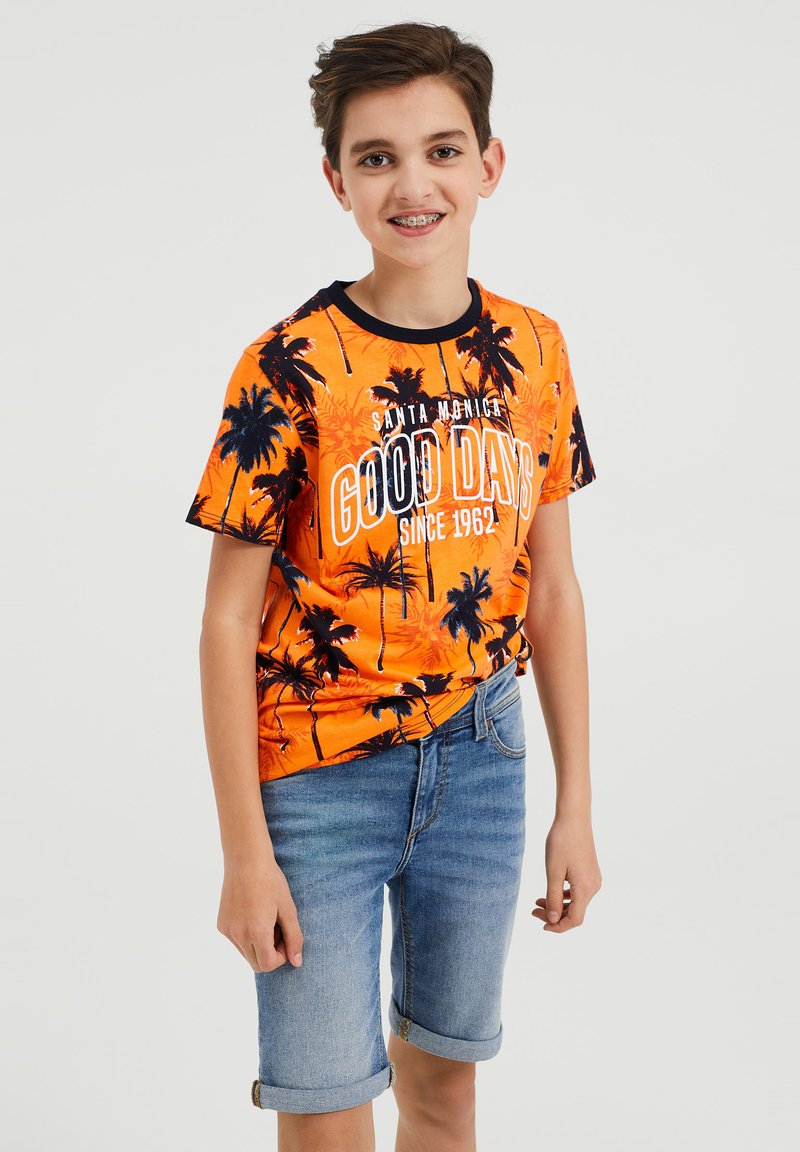 Elevate your spring/summer wardrobe with this stylish orange T-shirt from WE Fashion. The perfect choice for the man of style Casual, this tee features a trendy print and a comfortable fit. Pair it with your favorite jeans or shorts for a cool and casual look. Upgrade your casual wardrobe with this must-have T-shirt.