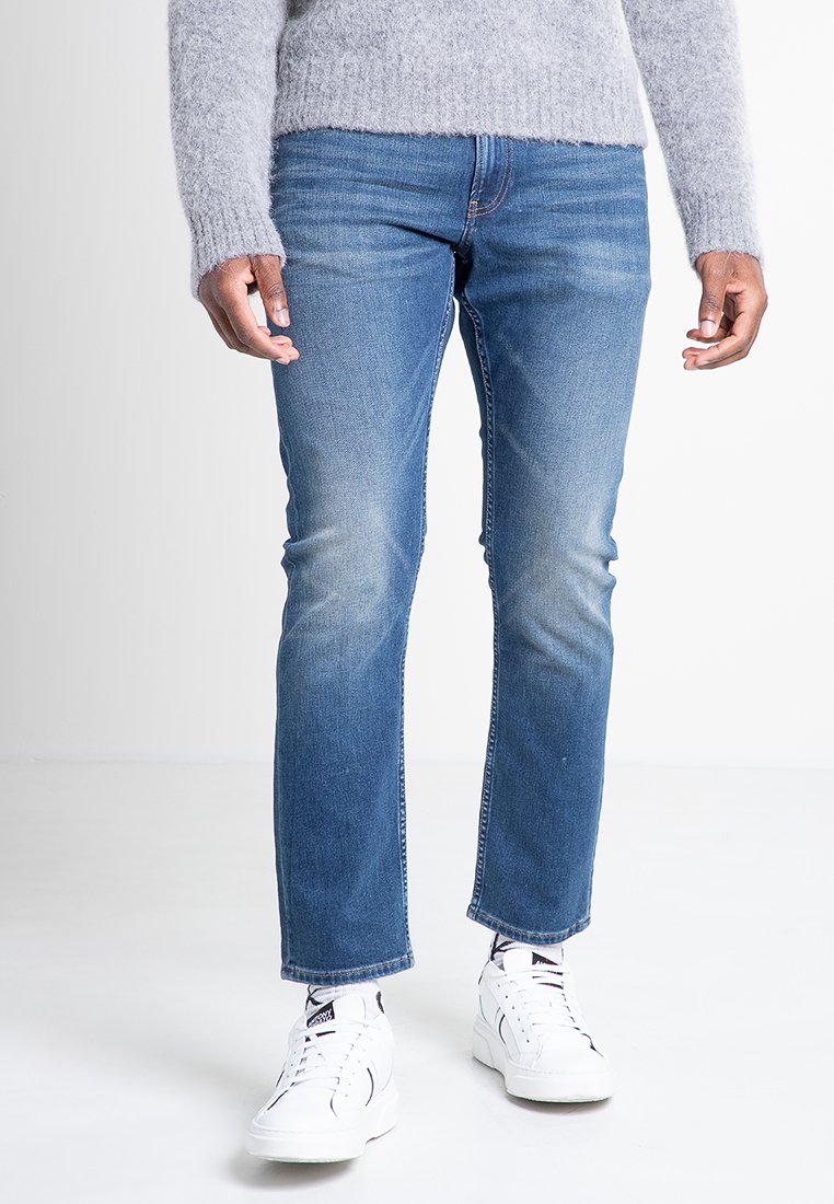 Stay stylish and comfortable this Autumn/Winter season with Calvin Klein's Casual Blue Slim Fit Jeans for Men. These versatile pants are perfect for any casual outing, featuring a modern slim fit design. Crafted from durable denim fabric, these jeans are a must-have addition to your wardrobe. Embrace timeless style with a touch of modern flair in these classic blue jeans.