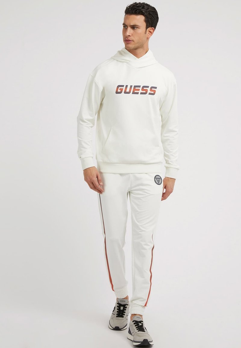 Elevate your casual style for Spring/Summer with these white Guess sporty pants for men. Made with high-quality material, these pants are perfect for a relaxed yet fashionable look. The versatile color pairs well with any top for a polished outfit. Upgrade your wardrobe with these stylish and comfortable pants from Guess.