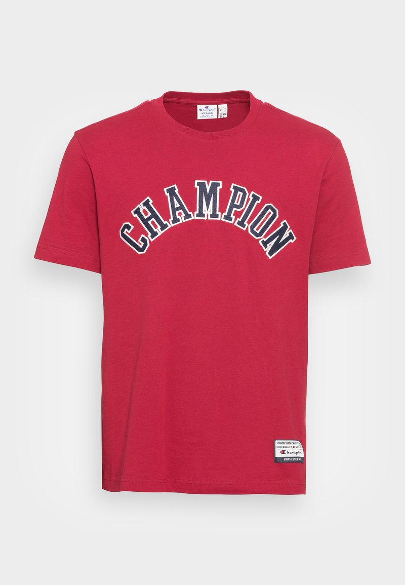 Elevate your casual look with this stylish Champion Rochester T-shirt for men. Perfect for the warmer months, this red tee features a bold graphic print that adds a pop of color to your wardrobe. Made for the man of style who wants to stand out, this shirt is a must-have for the Spring/Summer season. Upgrade your everyday outfit with this trendy and comfortable piece.