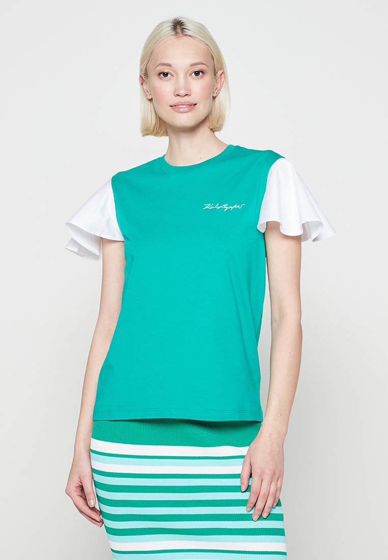 Stay effortlessly chic this Spring/Summer with the Karl Lagerfeld Casual T-shirt for Women in a refreshing Green hue. This basic tee is perfect for everyday wear, featuring a relaxed fit and soft cotton material. Elevate your casual wardrobe with this versatile piece, ideal for pairing with jeans or shorts for a stylish look. Experience comfort and style with this must-have T-shirt from Karl Lagerfeld.