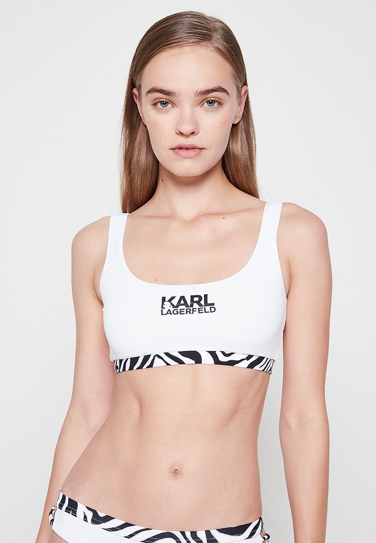 This sophisticated Karl Lagerfeld bikini top is perfect for the fashion-forward woman who loves to blend casual and elegant styles. Designed in a crisp white hue, it is ideal for the warmer Spring/Summer seasons. Pair this versatile piece with matching bottoms for a chic and timeless look that will surely turn heads.