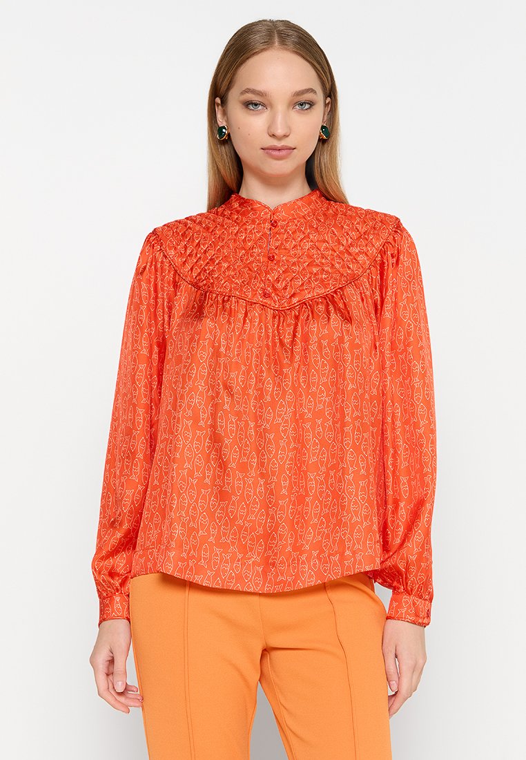 This Stella Nova blouse is perfect for the spring/summer season with its casual yet elegant style. In a vibrant orange hue, this versatile top can be dressed up or down for any occasion. Made with high-quality materials, the camicetta is a must-have addition to any woman's wardrobe. Stay stylish and chic with this trendy piece from Stella Nova.