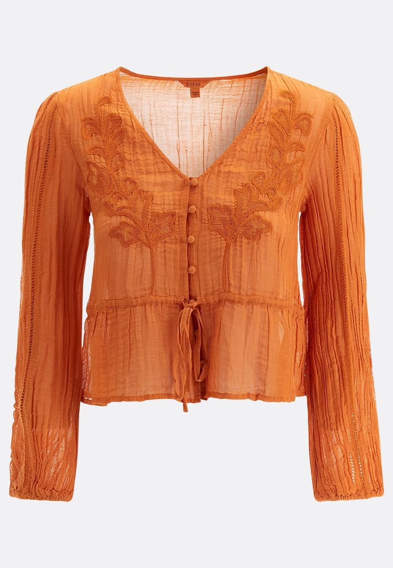 Stay stylish and chic in this Guess Women's Casual/Elegant Orange Blouse, perfect for the Spring/Summer season. The vibrant orange color adds a pop of color to any outfit, while the versatile design allows for easy day-to-night transitions. Whether paired with jeans for a casual look or dressed up with slacks for a more elegant ensemble, this blouse is a must-have for any fashionable woman's wardrobe. Elevate your style effortlessly with this Guess blouse.