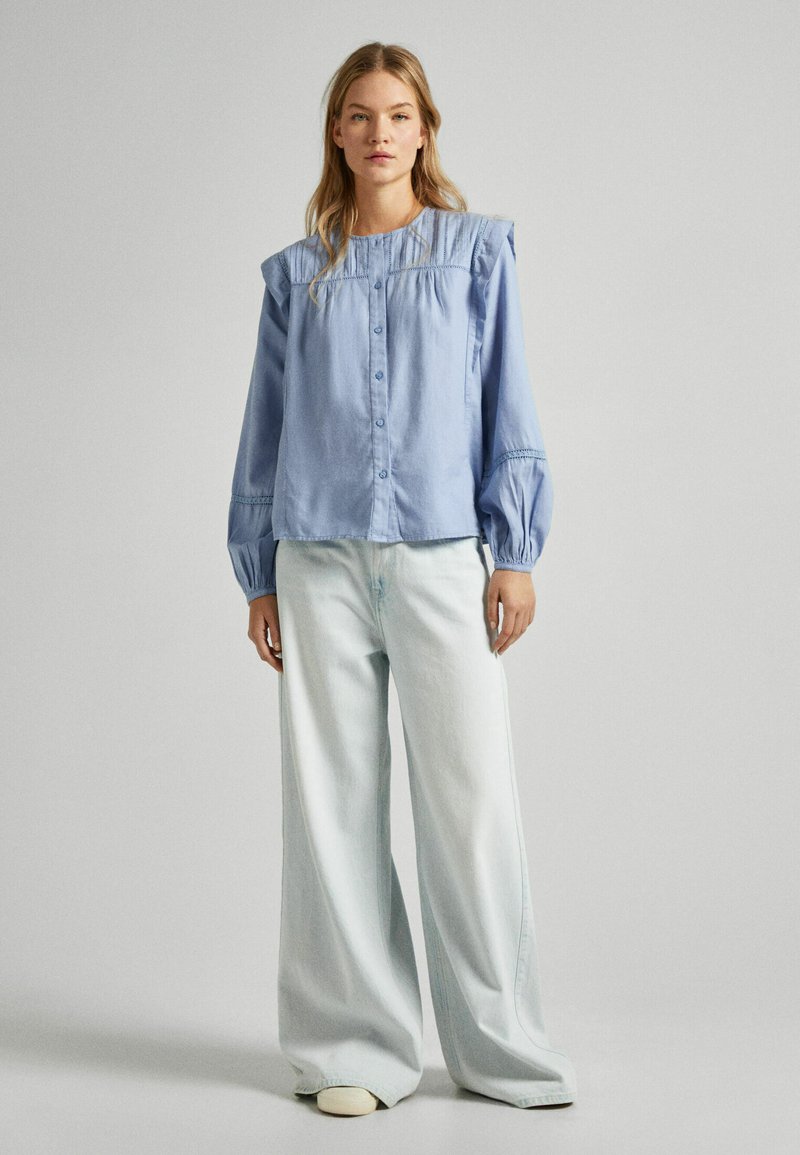Introducing the Pepe Jeans Blue Casual/Elegant Women's Blouse, perfect for the Spring/Summer season. This versatile piece can be dressed up or down for any occasion. Made with high-quality materials and a chic design, it is a must-have for your wardrobe. Stay stylish and comfortable all season long in this classic blue blouse.