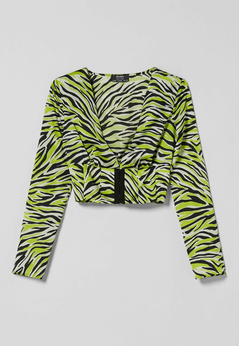 Introducing the stylish Casual/Elegant women's blouse from Bershka, perfect for the Spring/Summer season. This top in a refreshing green color exudes a chic and relaxed vibe. Pair it with jeans for a casual look or dress it up with tailored pants for a more elegant style. The versatile camicetta is a must-have addition to any wardrobe.