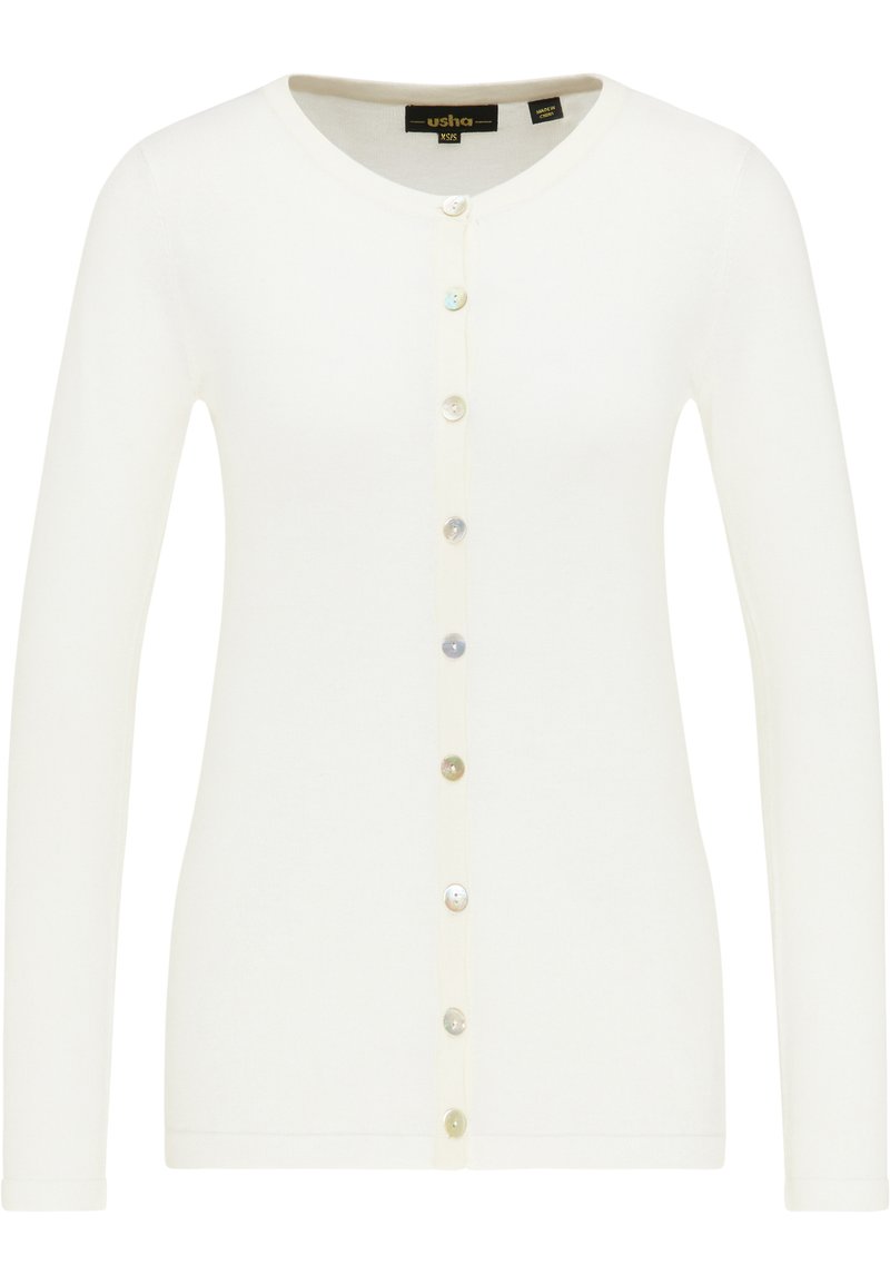 Introducing the Usha White Cardigan for Women, perfect for the Casual/Elegant style. This versatile piece is ideal for the Spring/Summer season, offering a timeless and sophisticated look. Made from lightweight fabric, this cardigan is a must-have addition to your wardrobe. Stay cool and chic in this stylish white cardigan from Usha.