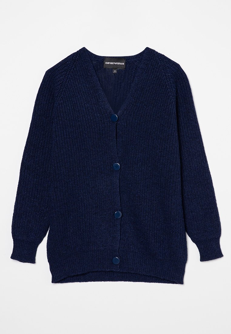 Stay cool and chic this Spring/Summer season with this casual yet elegant blue cardigan from Emporio Armani. Perfect for any occasion, this versatile piece is a must-have for any stylish woman. Its lightweight fabric and flattering silhouette make it a go-to choice for layering on those breezy days. Elevate your look with this Emporio Armani cardigan and stand out in style.