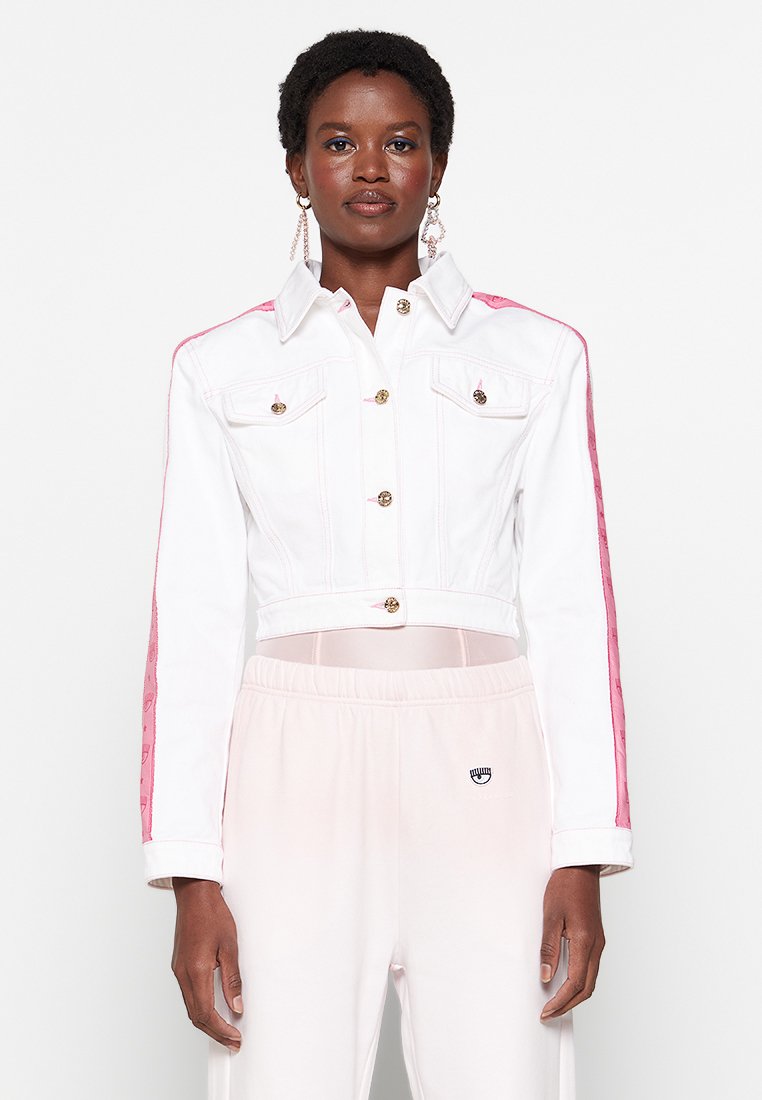 Stay warm and stylish this Autumn/Winter season with this Casual style white denim jacket by CHIARA FERRAGNI. Perfect for layering over your favorite outfits, this jacket adds a touch of elegance to any look. Featuring a classic denim jacket silhouette, this versatile piece is a must-have in any woman's wardrobe. Upgrade your outerwear collection with the chic giacca di jeans from CHIARA FERRAGNI.