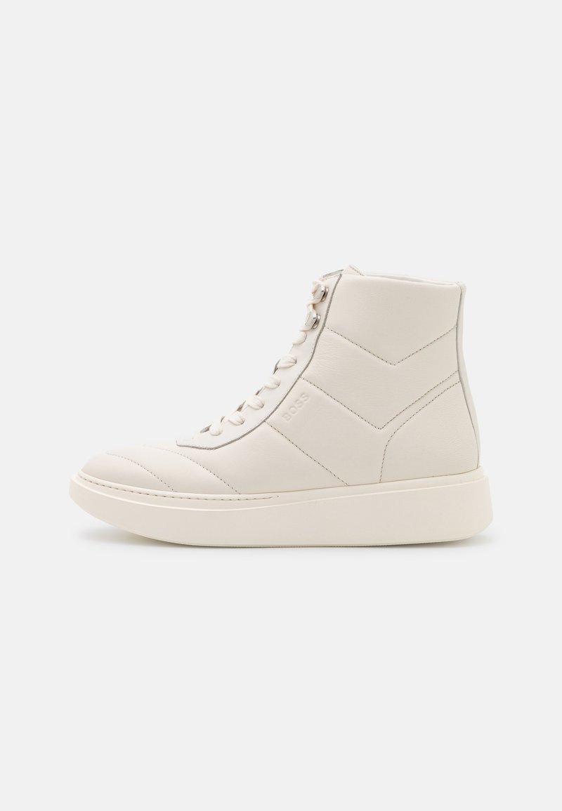 Stay stylish and comfortable this Autumn/Winter season with these Boss high-top sneakers in a crisp white color. Perfect for a sporty-casual look, these shoes are designed for women on the go. Made for all-day wear, these sneakers are both fashion-forward and practical. Elevate your wardrobe with these chic Boss sneakers.
