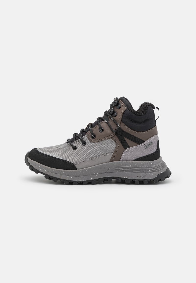 Stay stylish and comfortable this Autumn/Winter season with these Clarks high-top sneakers in a sleek grey color. Perfect for the sportive or casual look, these shoes are versatile and easy to pair with any outfit. Whether running errands or meeting friends for coffee, these sneakers will keep you looking chic all day long. Elevate your shoe game with these trendy and practical Clarks sneakers.
