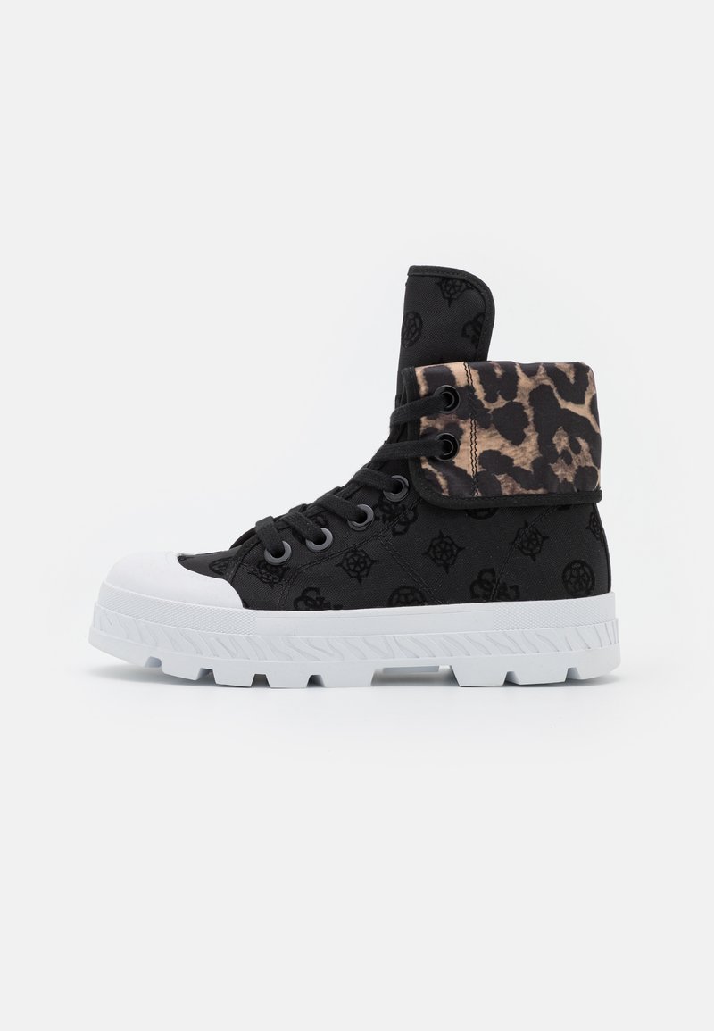 Elevate your casual winter wardrobe with these high-top sneakers from Guess. The sleek black design adds a touch of sporty style to any outfit. Perfect for staying comfortable and fashionable during the colder months. These versatile shoes are a must-have for any fashion-forward woman.