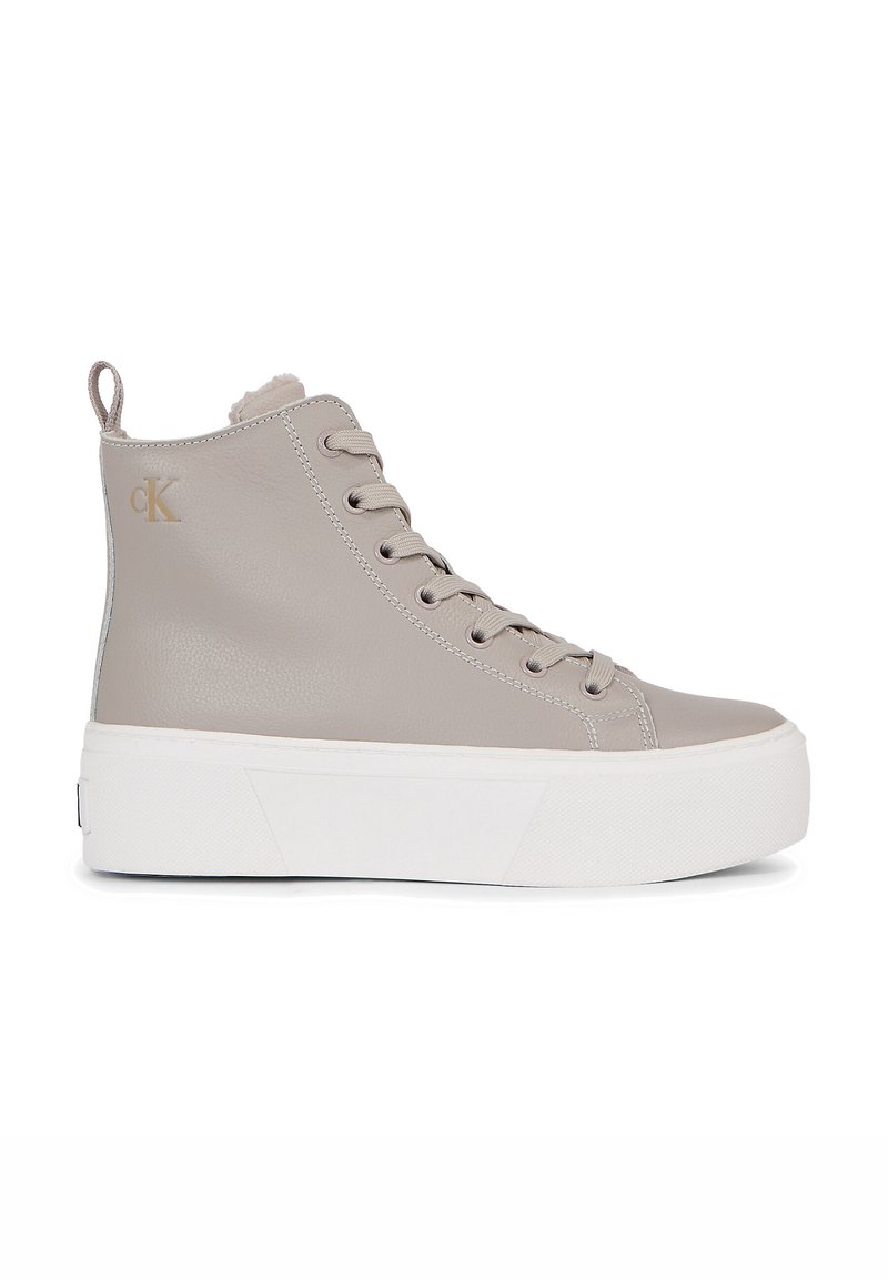 Stay stylish and comfortable this Autumn/Winter season with these Calvin Klein Jeans Grey High Top Sneakers for Women. Perfect for a sporty yet casual look, these shoes are ideal for everyday wear. Featuring a trendy grey color, these sneakers are versatile and can be paired with any outfit. Elevate your footwear collection with these sportive yet fashionable Calvin Klein Jeans sneakers.