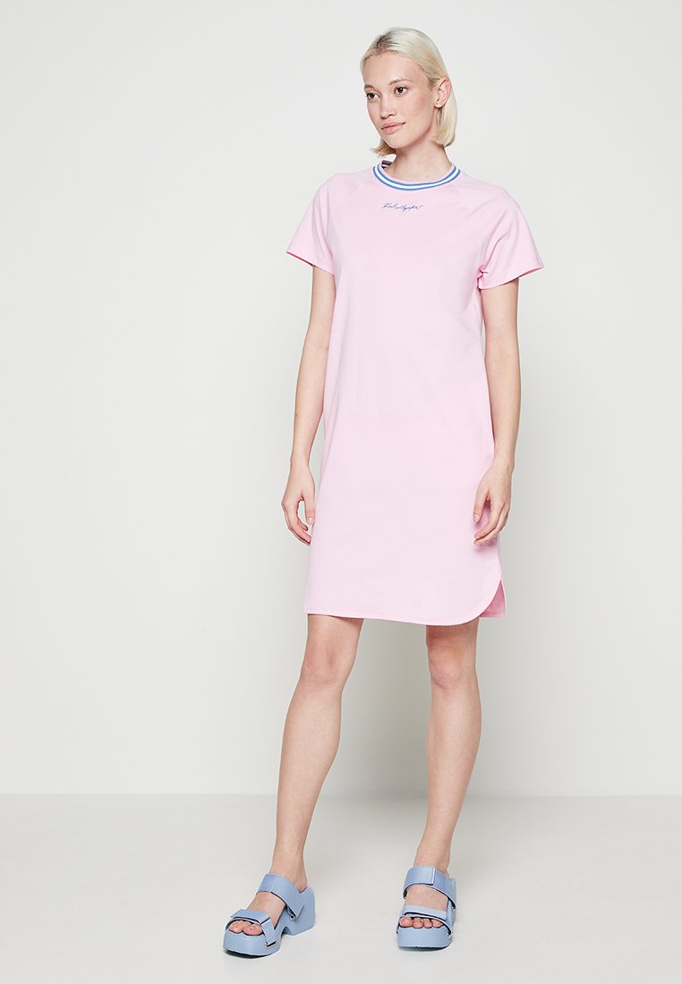 This Karl Lagerfeld dress is perfect for the Spring/Summer season, blending casual and elegant style effortlessly. The soft pink color adds a feminine touch to any outfit, making it versatile for day or evening wear. With its comfortable knit fabric and timeless design, this dress is a must-have staple for any woman's wardrobe. Dress up or down with accessories for a chic look all season long.