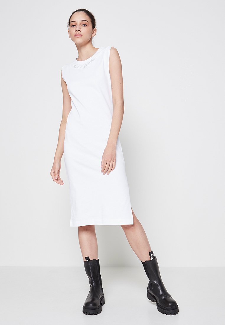 Stay chic and versatile this Spring/Summer with the Karl Lagerfeld White Knit Dress. Effortlessly blending casual comfort with elegant style, this dress is perfect for any occasion. Its lightweight fabric and neutral color make it a must-have piece for your warm weather wardrobe. Elevate your look with this timeless piece from Karl Lagerfeld.