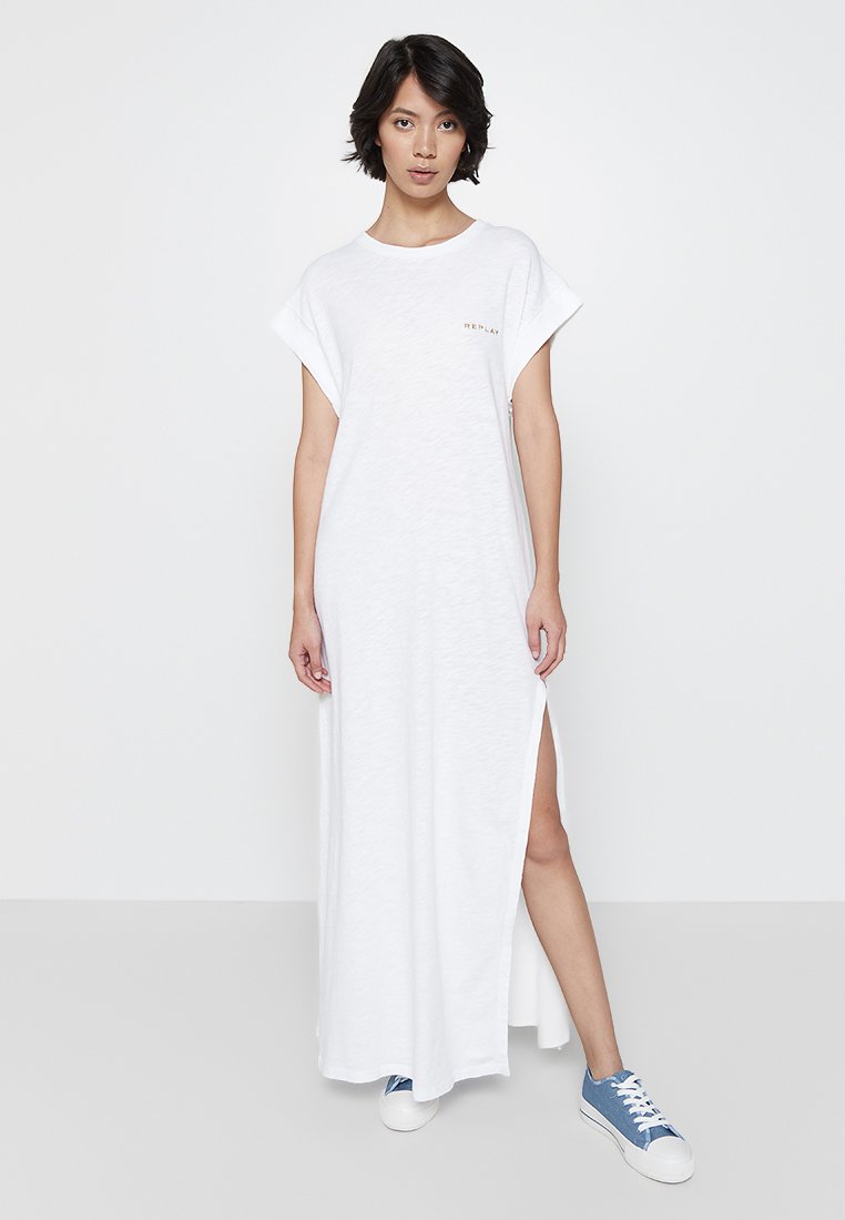 This white casual/elegant dress from Replay is perfect for the Spring/Summer season. Its simple yet stylish design makes it versatile for various occasions. Made with soft jersey fabric, it offers comfort and a flattering silhouette. A must-have piece for any woman looking to effortlessly elevate her wardrobe.