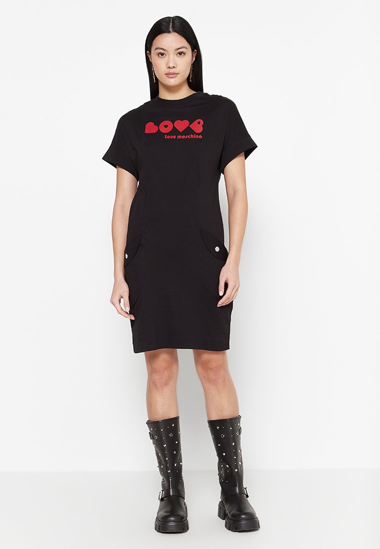 Stay effortlessly chic in this Love Moschino Casual/Elegant dress for women. Perfect for the Spring/Summer season, this black knit dress combines comfort with style. The versatile design makes it easy to dress up or down for any occasion. Add a touch of sophistication to your wardrobe with this must-have piece.