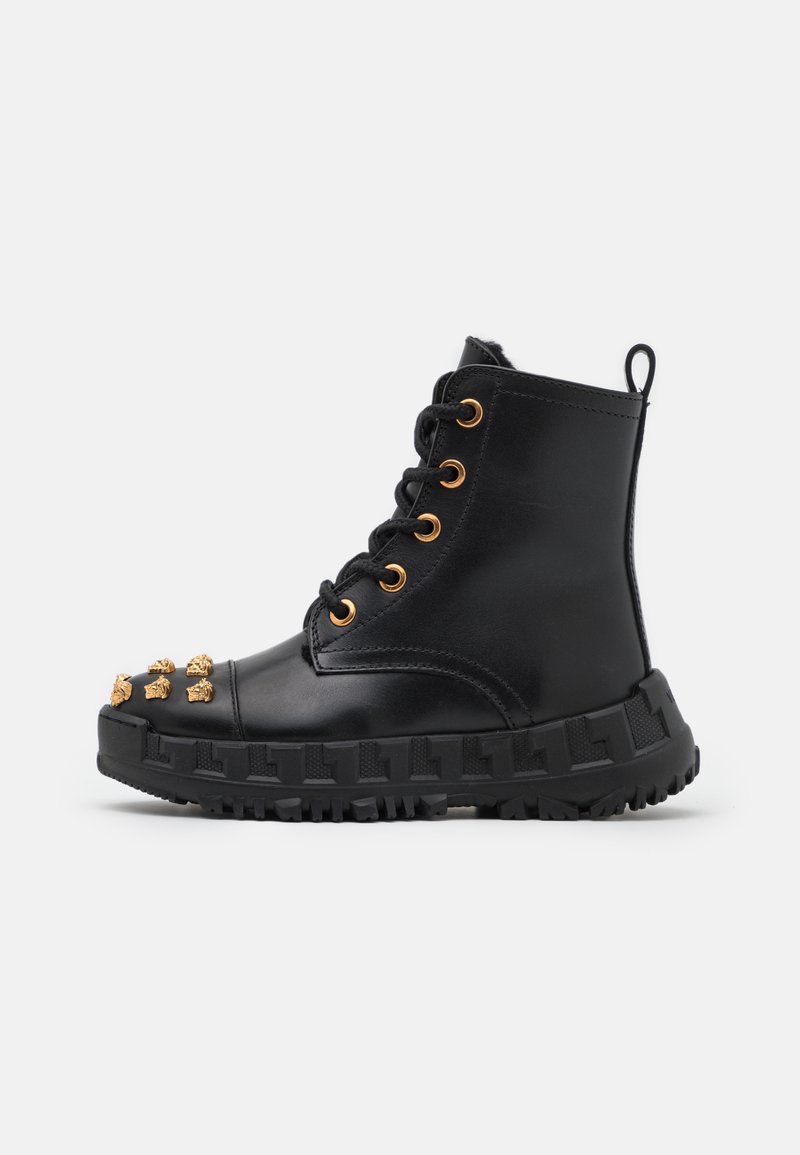 Stay stylish and comfortable this Autumn/Winter season with these Casual Women's Boots from Versace. Crafted in sleek black, these lace-up ankle boots are versatile and chic. Perfect for everyday wear, these boots are a must-have addition to your winter wardrobe.