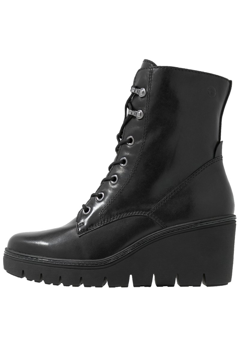 Stay stylish and comfortable this Autumn/Winter season with these casual Black Boots from the brand Tamaris. These lace-up ankle boots are perfect for everyday wear, featuring a sleek design that pairs effortlessly with any outfit. Step out in style and keep your feet warm and fashionable with these Tamaris Boots.