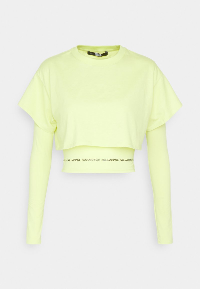 Elevate your spring/summer wardrobe with this Karl Lagerfeld women's long sleeve t-shirt in a vibrant yellow hue. Perfect for casual outings and elegant occasions, this versatile top seamlessly blends comfort and style. The soft fabric and flattering silhouette make it a must-have piece for the season. Transition effortlessly from day to night with this chic yellow long sleeve tee.