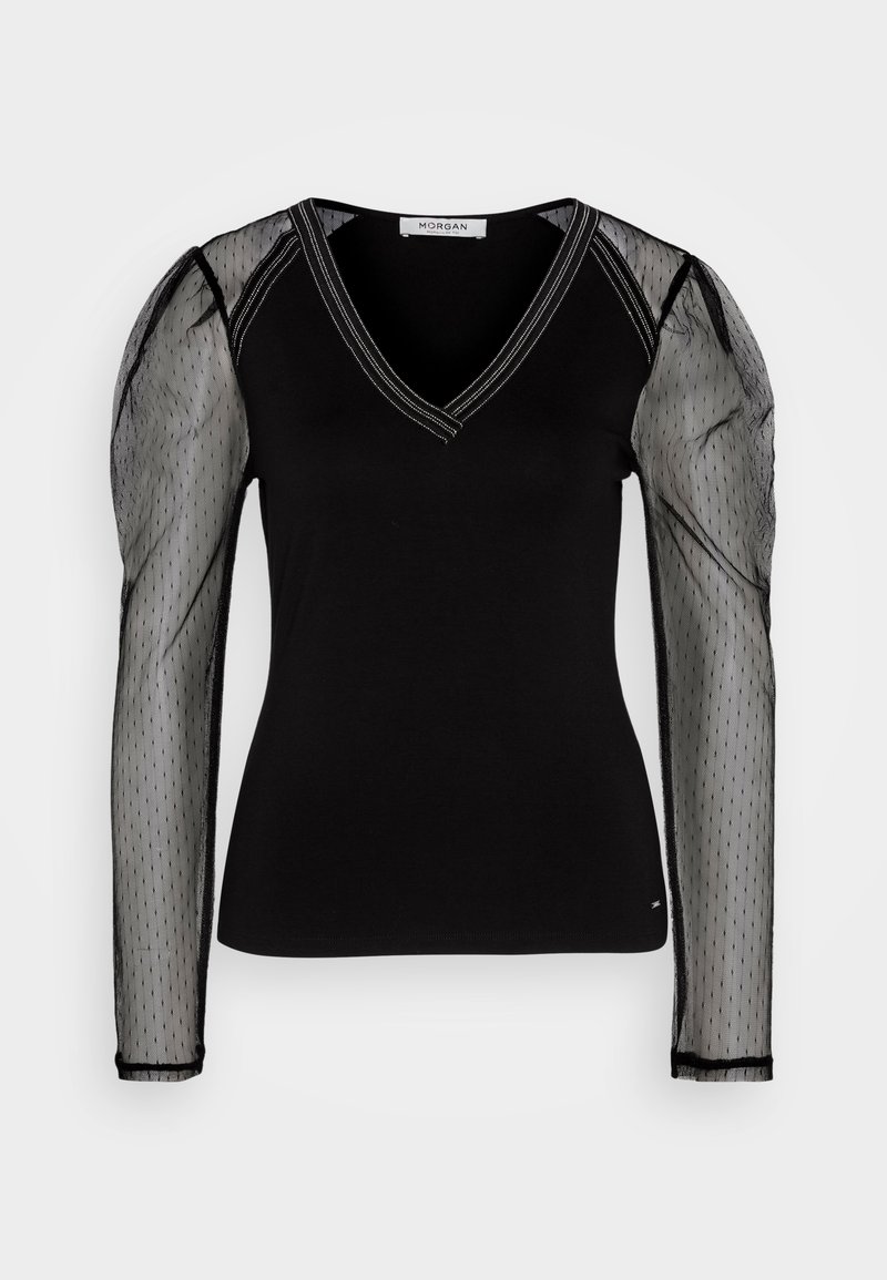 Elevate your casual look with this black long-sleeve top from Morgan. Perfect for the Spring/Summer season, this versatile piece effortlessly combines elegance and comfort. Whether paired with jeans for a relaxed day out or dressed up with trousers for a chic evening look, this top is a must-have staple for any woman's wardrobe. Experience the perfect blend of style and sophistication with Morgan's long-sleeve top.