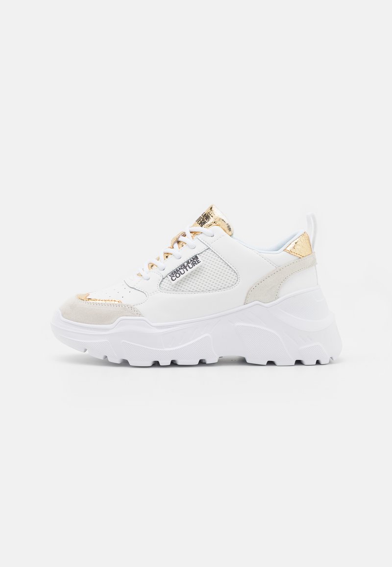 Stay stylish and comfortable this Autumn/Winter with the Versace Jeans Couture Sportive/Casual sneakers in White. These trendy low-top sneakers are perfect for everyday wear, whether you're running errands or meeting friends for brunch. The sleek design and iconic Versace logo make these shoes a must-have addition to your wardrobe. Elevate your street style with these versatile and chic sneakers from Versace Jeans Couture.