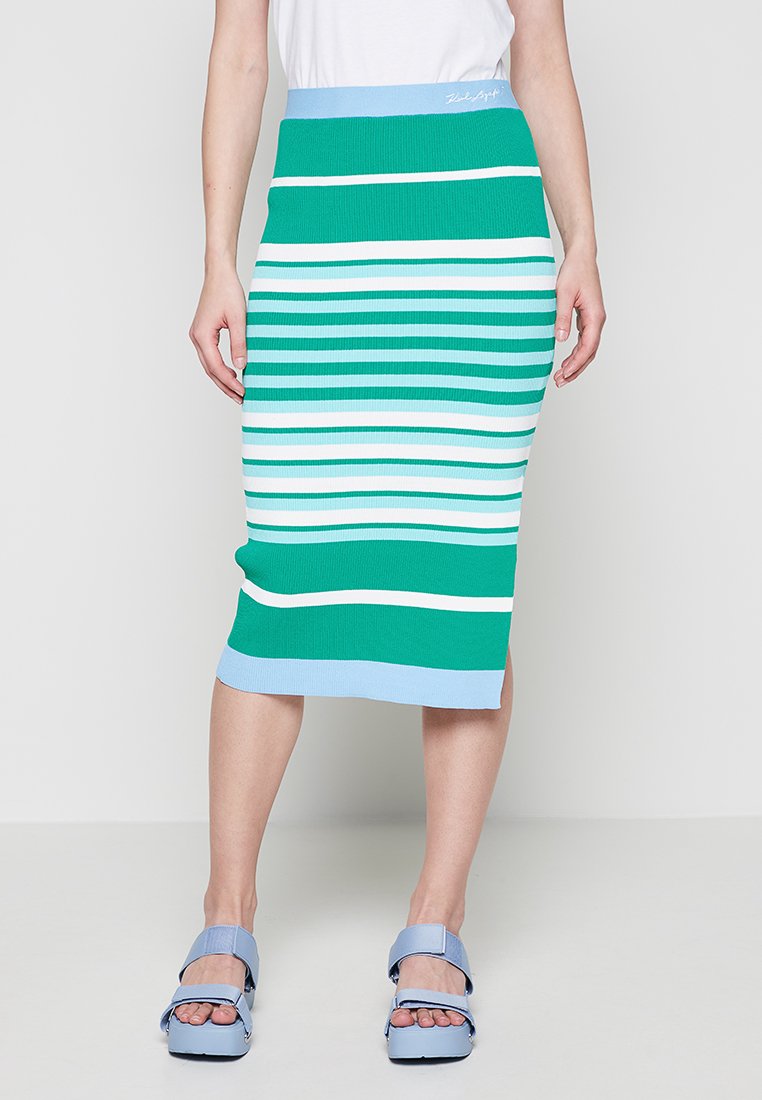 Elevate your spring/summer wardrobe with this Casual/Elegant green pencil skirt from Karl Lagerfeld. Perfect for both daytime outings and evening events, this versatile piece effortlessly combines style and comfort. Crafted with high-quality materials, it offers a flattering silhouette and timeless sophistication. Make a statement wherever you go in this must-have piece.