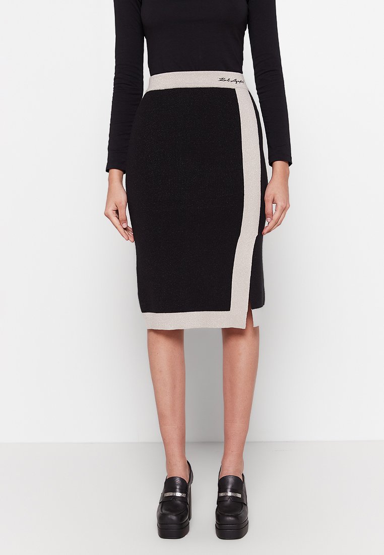 Elevate your spring/summer wardrobe with this versatile Karl Lagerfeld black pencil skirt. Combining casual comfort with elegant sophistication, this skirt is perfect for any occasion. Its sleek design and flattering fit make it a must-have for the season. Add a touch of luxury to your look with this timeless piece.