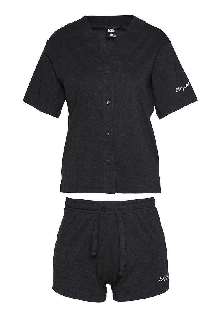 Stay chic and comfortable in this Karl Lagerfeld Women's Pajama Set. Perfect for the warmer months, this black ensemble exudes casual elegance. Whether lounging at home or running errands, this versatile set will keep you looking effortlessly stylish. Add a touch of luxury to your Spring/Summer wardrobe with this must-have piece.