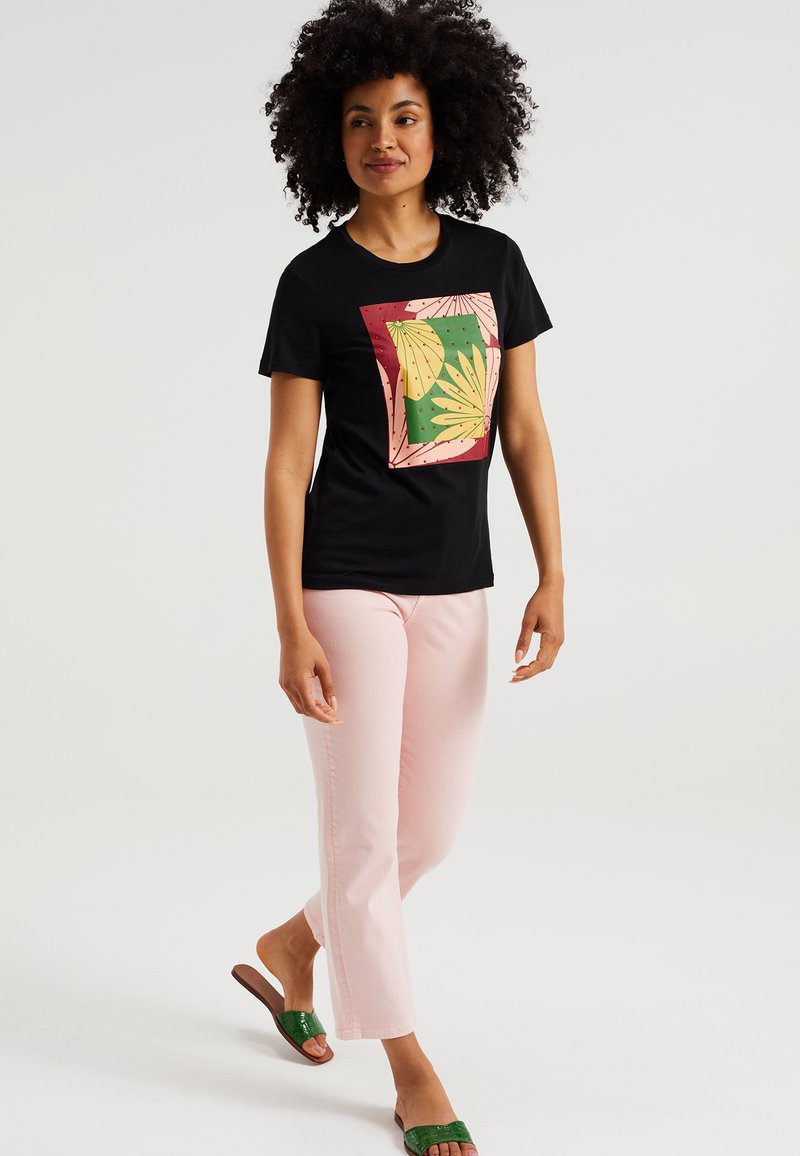 Stay cool and stylish this Spring/Summer with the Women's Casual T-shirt from WE Fashion. This black tee features a trendy print, perfect for adding a fun touch to your outfit. Pair it with your favorite jeans or shorts for a laid-back look that's perfect for any casual occasion. Upgrade your wardrobe with this versatile and comfortable t-shirt.