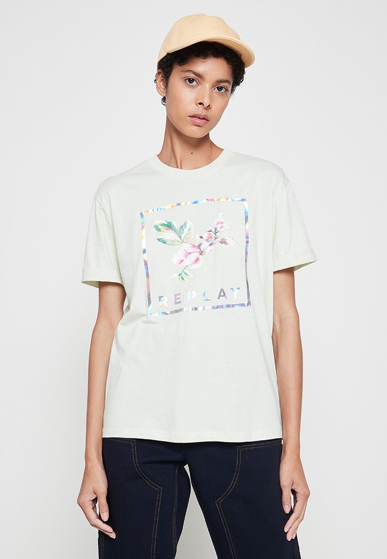 Elevate your casual style with this Replay Women's Green Printed T-Shirt for the Spring/Summer season. Designed with a trendy print, this t-shirt is perfect for adding a pop of color to your wardrobe. Made with high-quality materials, this t-shirt is both stylish and comfortable, making it a must-have for your summer wardrobe. Stand out in style with this chic and versatile t-shirt from Replay.