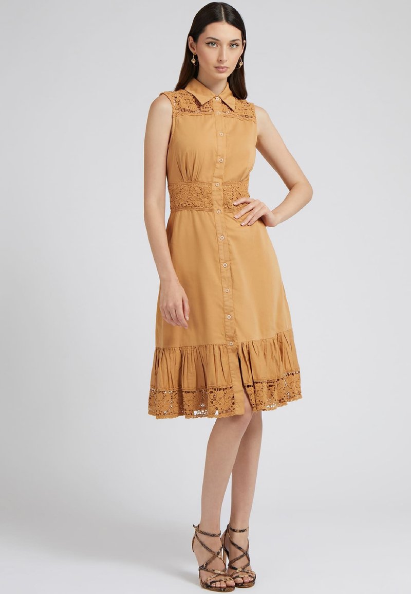 Introducing the Guess Casual/Elegant Women's Beige Shirt Dress, perfect for the Spring/Summer season. This versatile piece effortlessly combines comfort with style, making it ideal for both casual outings and more formal events. The breathable fabric and flattering silhouette make it a must-have addition to any wardrobe. Elevate your look with this chic and timeless dress from Guess.
