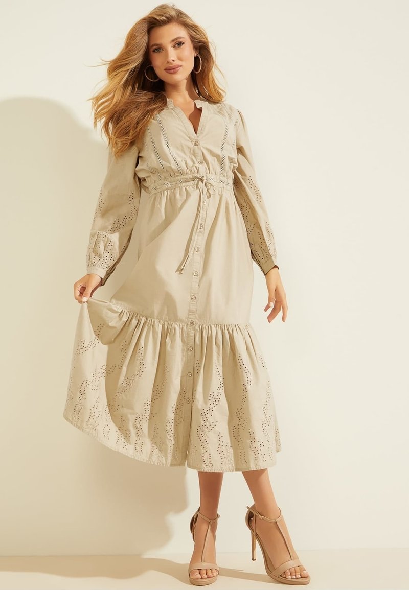 Introducing the Guess Casual/Elegant Women's Beige Shirt Dress, perfect for the Spring/Summer season. This versatile piece effortlessly combines comfort with style, making it ideal for both casual outings and more formal events. The breathable fabric and flattering silhouette make it a must-have addition to any wardrobe. Elevate your look with this chic and timeless dress from Guess.