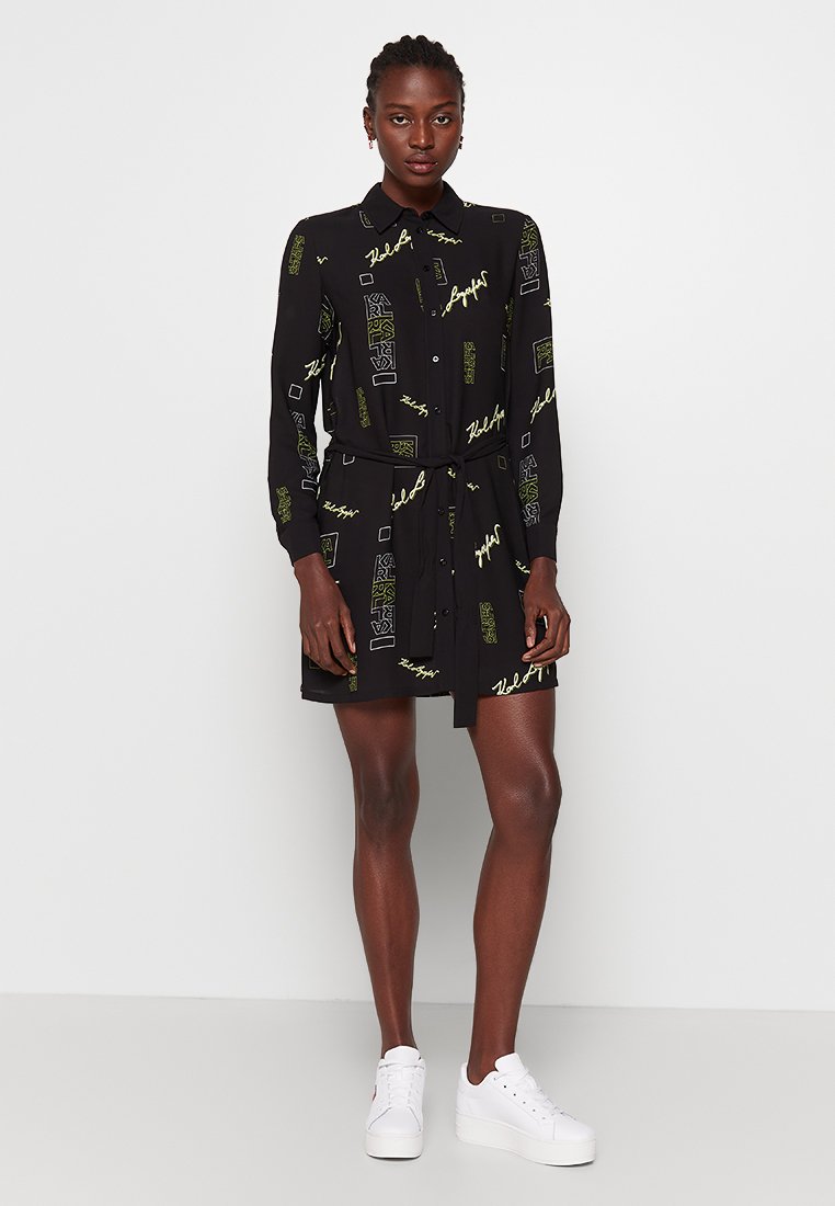 Elevate your Spring/Summer wardrobe with this Casual/Elegant black shirt dress from Karl Lagerfeld. This versatile piece effortlessly combines comfort and style, perfect for any occasion. Its timeless design and flattering silhouette make it a must-have for the season. Stay chic and effortlessly cool in this iconic piece.