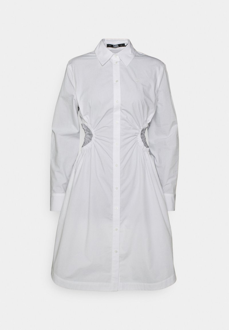 Elevate your spring/summer wardrobe with this Casual/Elegant shirt dress from Karl Lagerfeld. The crisp white color adds sophistication to any outfit, while the relaxed fit keeps you comfortable all day long. Perfect for any occasion, this versatile piece embodies effortless style and timeless chic. Add a touch of Karl Lagerfeld luxury to your closet this season.