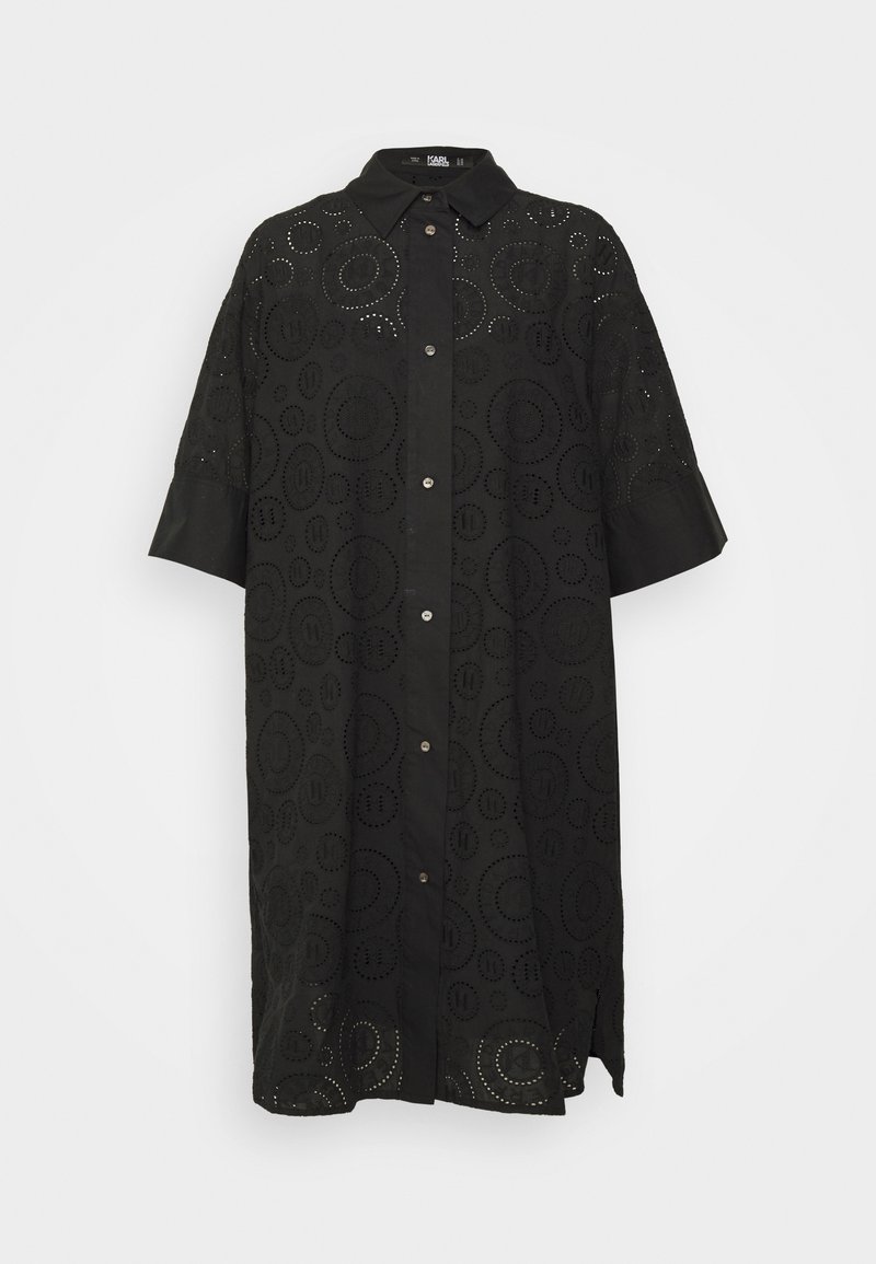 Elevate your Spring/Summer wardrobe with this Casual/Elegant black shirt dress from Karl Lagerfeld. This versatile piece effortlessly combines comfort and style, perfect for any occasion. Its timeless design and flattering silhouette make it a must-have for the season. Stay chic and effortlessly cool in this iconic piece.