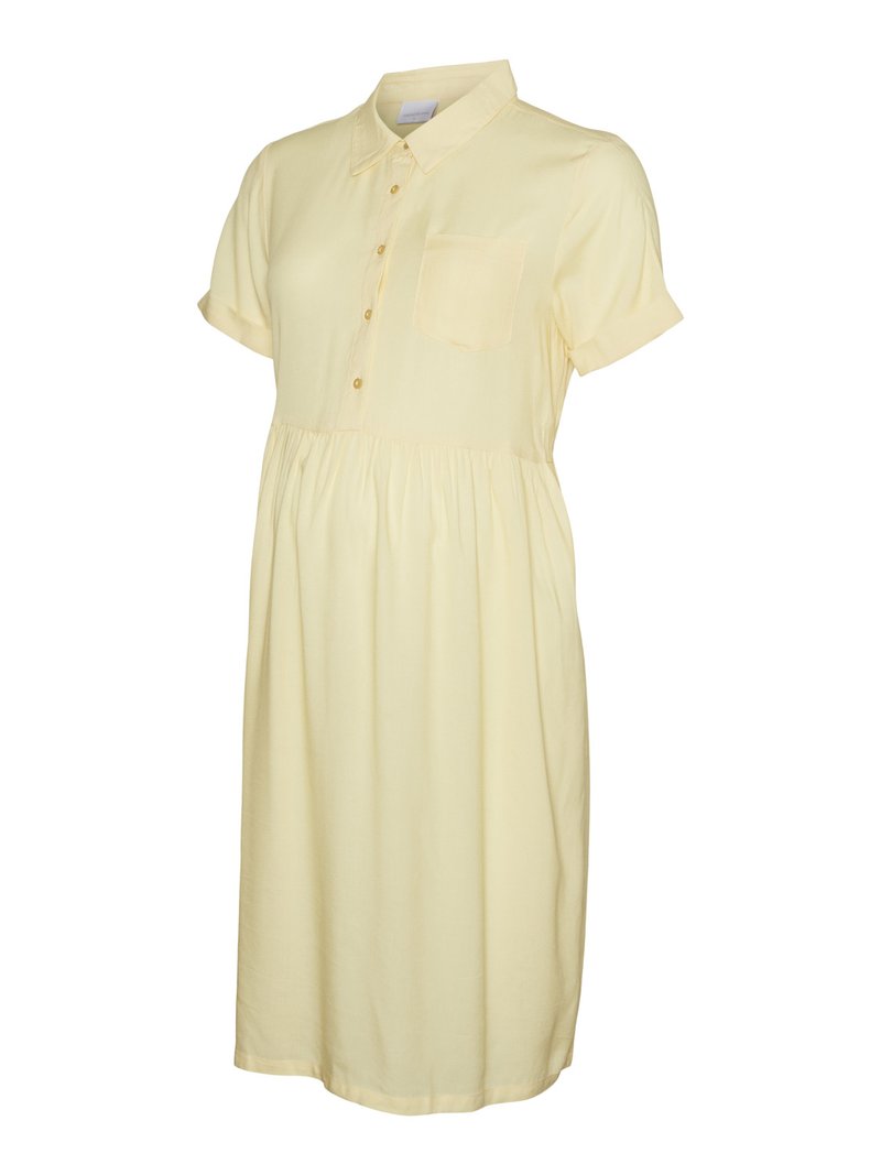 Introducing the Casual/Elegant Yellow Shirt Dress from Mamalicious, perfect for the Spring/Summer season. This stylish piece effortlessly combines comfort and sophistication, making it ideal for any occasion. With its vibrant yellow hue, this dress will add a pop of color to your wardrobe. Stay chic and comfortable all season long with this must-have Mamalicious piece.
