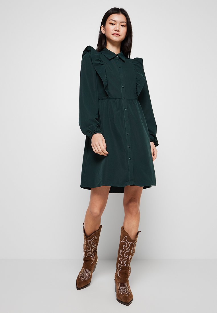 Introducing the JDY Casual/Elegant Women's Shirt Dress in a refreshing Green hue, perfect for the Spring/Summer season. This versatile piece effortlessly combines comfort with sophistication, ideal for any occasion. Elevate your style with this chic and timeless wardrobe essential from JDY. Perfect for a day out or a casual evening gathering.