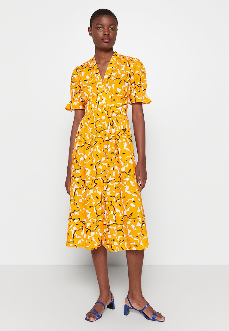 Introducing the Spring/Summer must-have from Diane von Furstenberg: a Casual/Elegant Women's dress in a sunny Yellow hue. This versatile piece effortlessly transitions from day to night with its flattering silhouette and sophisticated design. Perfect for any warm-weather occasion, this dress combines style and comfort to elevate your seasonal wardrobe. Embrace the chic charm of this timeless staple and step out in effortless elegance.