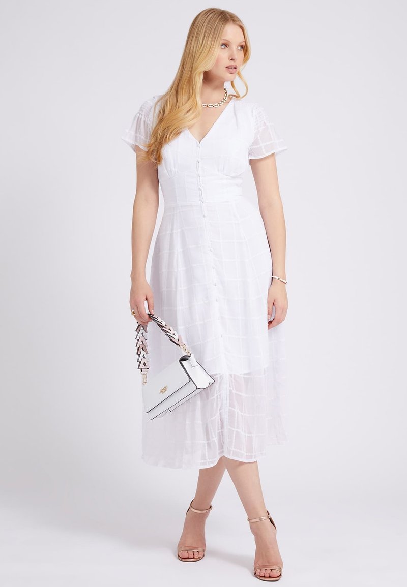 Stay cool and chic this Spring/Summer with the Guess Casual/Elegant Women's Dress in classic White. This versatile piece is perfect for any occasion, whether you're running errands or attending a backyard BBQ. The flattering silhouette and lightweight fabric make it ideal for warm weather. Elevate your style with this must-have wardrobe staple.