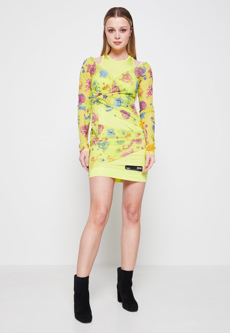Introducing the perfect blend of casual and elegant style with this Versace Jeans Couture dress for women. Designed in a vibrant yellow hue, this dress is ideal for the upcoming Spring/Summer season. Whether you're heading to a brunch or a garden party, this versatile piece will keep you looking chic and on-trend. Add a touch of sophistication to your wardrobe with this must-have dress.